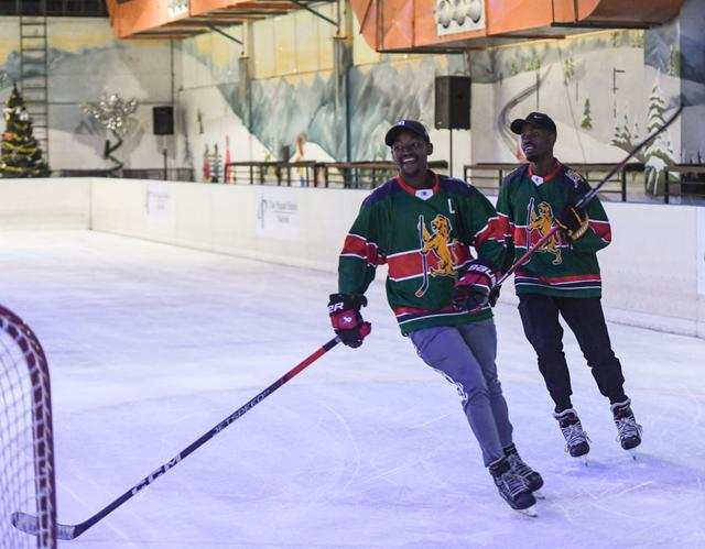 2025年11月22日,在肯尼亚内罗毕,肯尼亚“冰狮”冰球队队长本杰明·姆布鲁(左)和门将泰森·迈克尔在冰场训练。新华社记者 李亚辉 摄